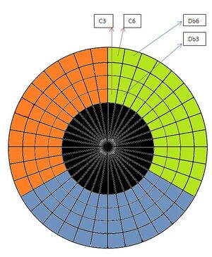 - Está dividido en tres partes y distribuido de manera circular, donde cada sección está compuesta por las 12 notas musicales que tendrán su registro propio y es polifónico, reproduce hasta 6 voces a la vez.