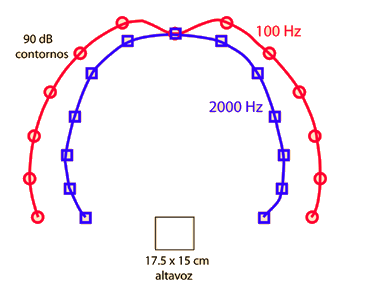 Las curvas de la izquierda, representan contornos de igual intensidad a 90 decibelios para el sonido producido por un pequeño altavoz en una caja