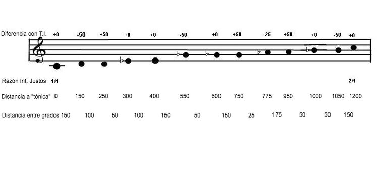 La escala contiene saltos de tres cuartos de tono (como el de Do4 al primer Re4), saltos de un semitono (como el de Mib a Mi), saltos de un cuarto de tono, y un salto de un octavo de tono (el de Sol a Lab). Hay notas que conforman partes de una escala cromática y de una hexatónica. La cantidad de cents que se alteran en comparación al temperamento igual va desde 50 hasta 100.